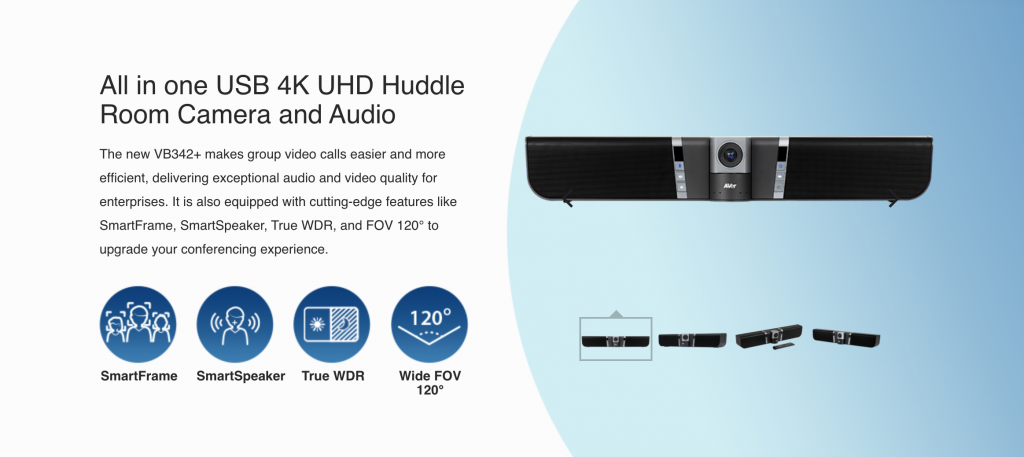 The new VB342+ makes group video calls easier and more efficient, delivering exceptional audio and video quality for enterprises. It is also equipped with cutting-edge features like SmartFrame, SmartSpeaker, True WDR, and FOV 120° to upgrade your conferencing experience.
